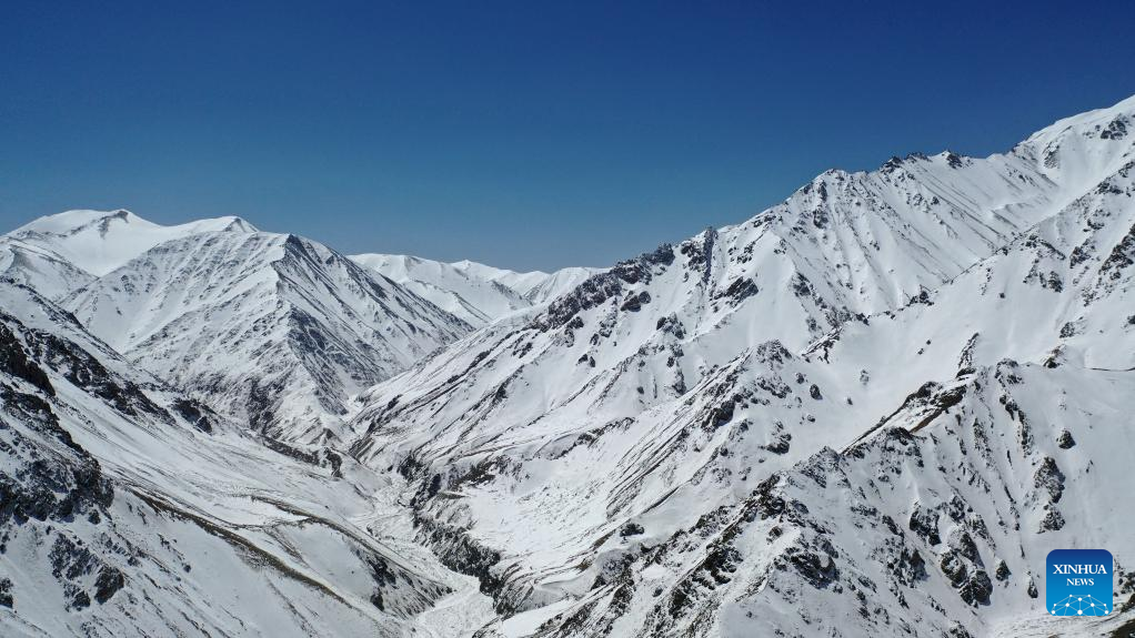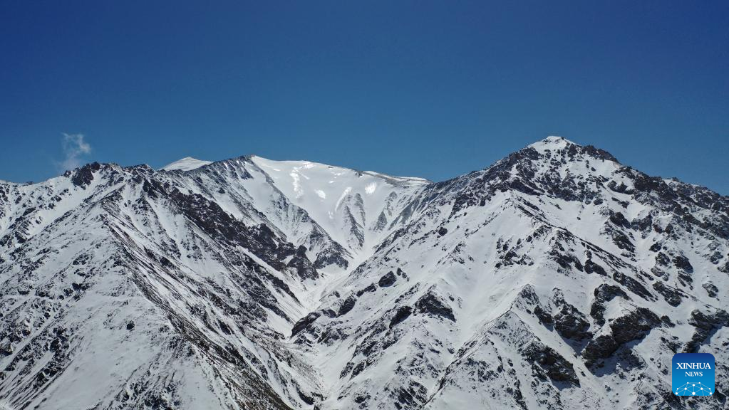 Aerial photo taken on April 17, 2022 shows the snow mountain in Dangchengwan Township of Subei Mongolian Autonomous County, northwest China's Gansu Province. (Xinhua/Chen Bin)