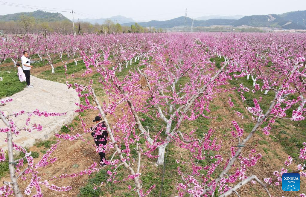 Aerial photo shows tourists visiting a peach orchard in Pinggu District of Beijing, capital of China, April 17, 2022. (Xinhua/Ren Chao)