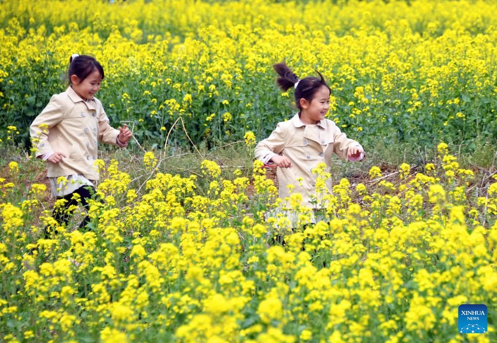 Children play in a cole flower field in Pinggu District of Beijing, capital of China, April 17, 2022. (Xinhua/Ren Chao)