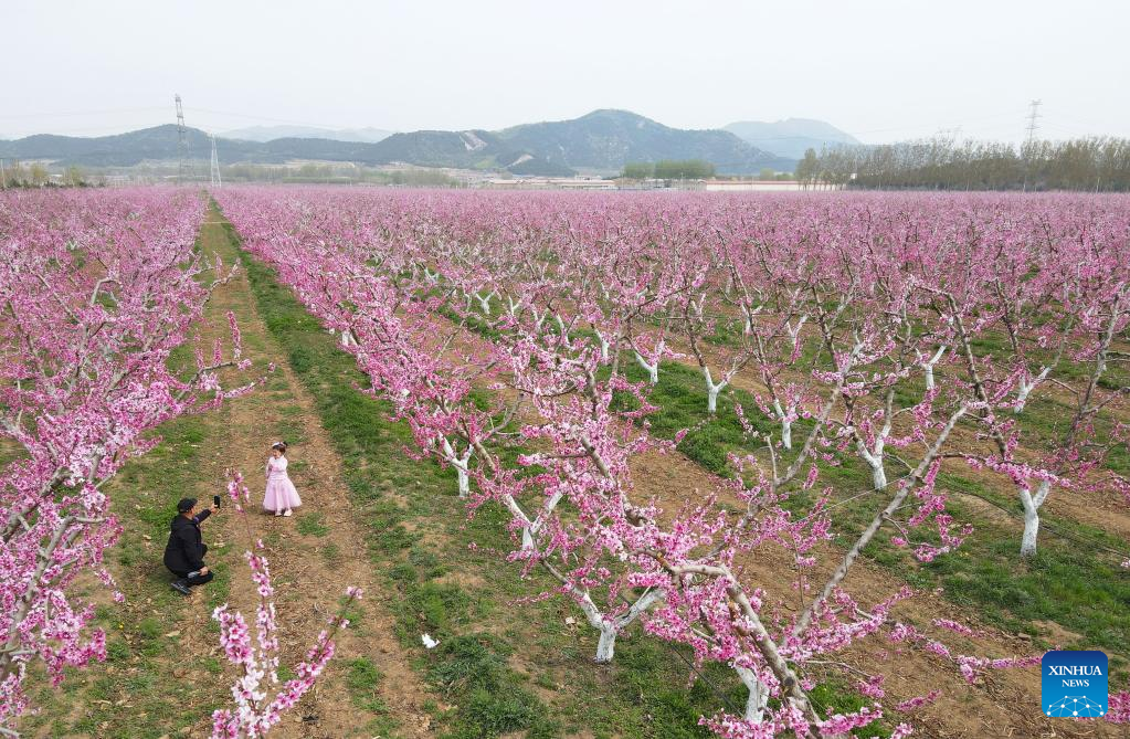 Aerial photo shows a peach orchard in Pinggu District of Beijing, capital of China, April 17, 2022. (Xinhua/Ren Chao)