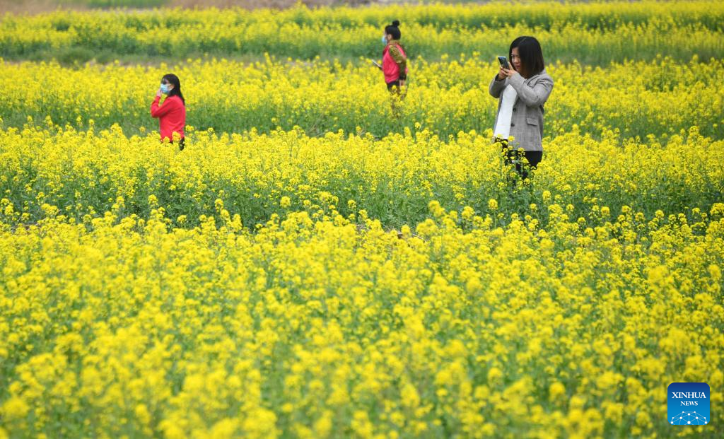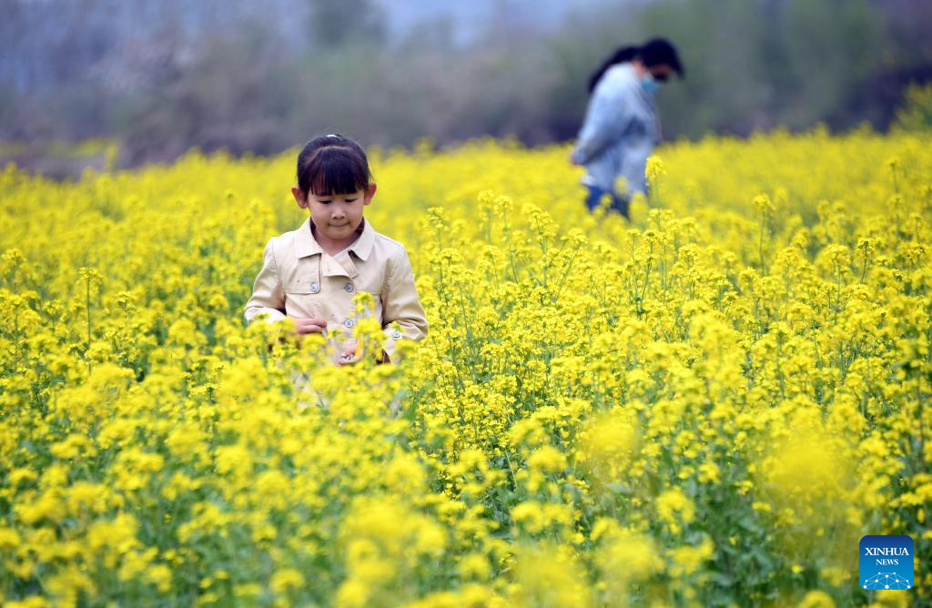 Tourists visit a cole flower field in Pinggu District of Beijing, capital of China, April 17, 2022. (Xinhua/Ren Chao)