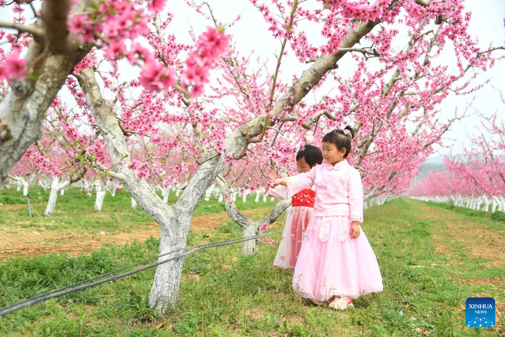 Children visit a peach orchard in Pinggu District of Beijing, capital of China, April 17, 2022. (Xinhua/Ren Chao)