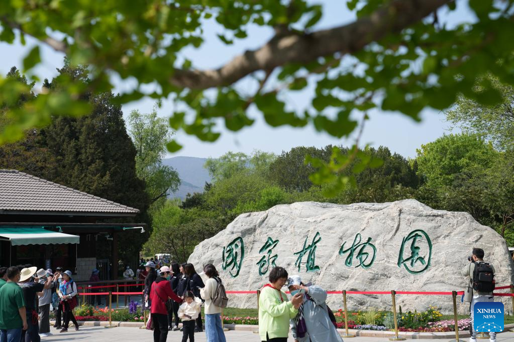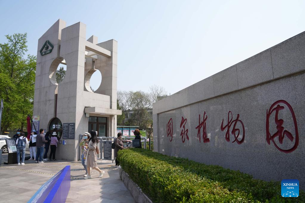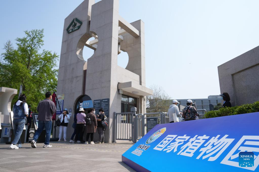 People visit the China National Botanical Garden in Beijing, capital of China, April 18, 2022. (Xinhua/Ju Huanzong)