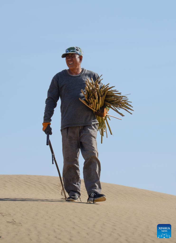 A worker transfers salix saplings at an eco-tourism area in Dalad Banner, north China's Inner Mongolia Autonomous Region, April 18, 2022. (Xinhua/Wang Zecong)