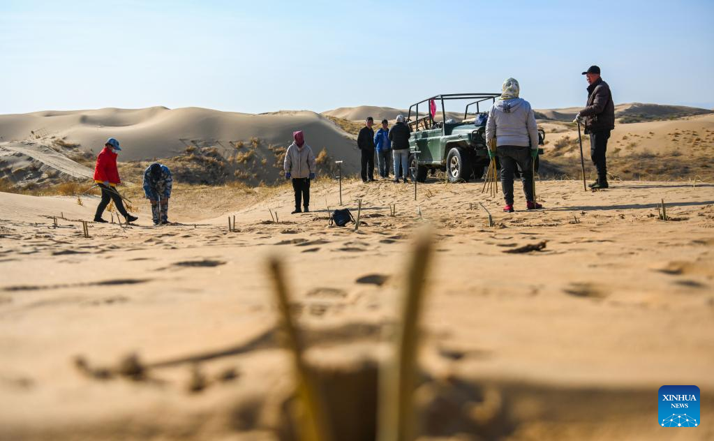Workers plant salix at an eco-tourism area in Dalad Banner, north China's Inner Mongolia Autonomous Region, April 18, 2022. (Xinhua/Liu Lei)