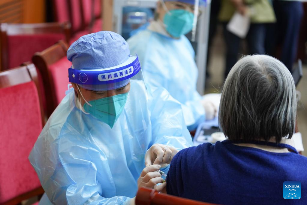 A medical worker injects COVID-19 vaccine for a senior citizen in Dongcheng District of Beijing, capital of China, April 18, 2022. Dongcheng District set exclusive venues for senior citizens to get COVID-19 vaccines. (Xinhua/Ju Huanzong)