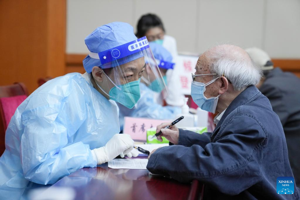 A medical worker explains the content of a consent letter to a recipient of COVID-19 vaccine in Dongcheng District of Beijing, capital of China, April 18, 2022. Dongcheng District set exclusive venues for senior citizens to get COVID-19 vaccines. (Xinhua/Ju Huanzong)