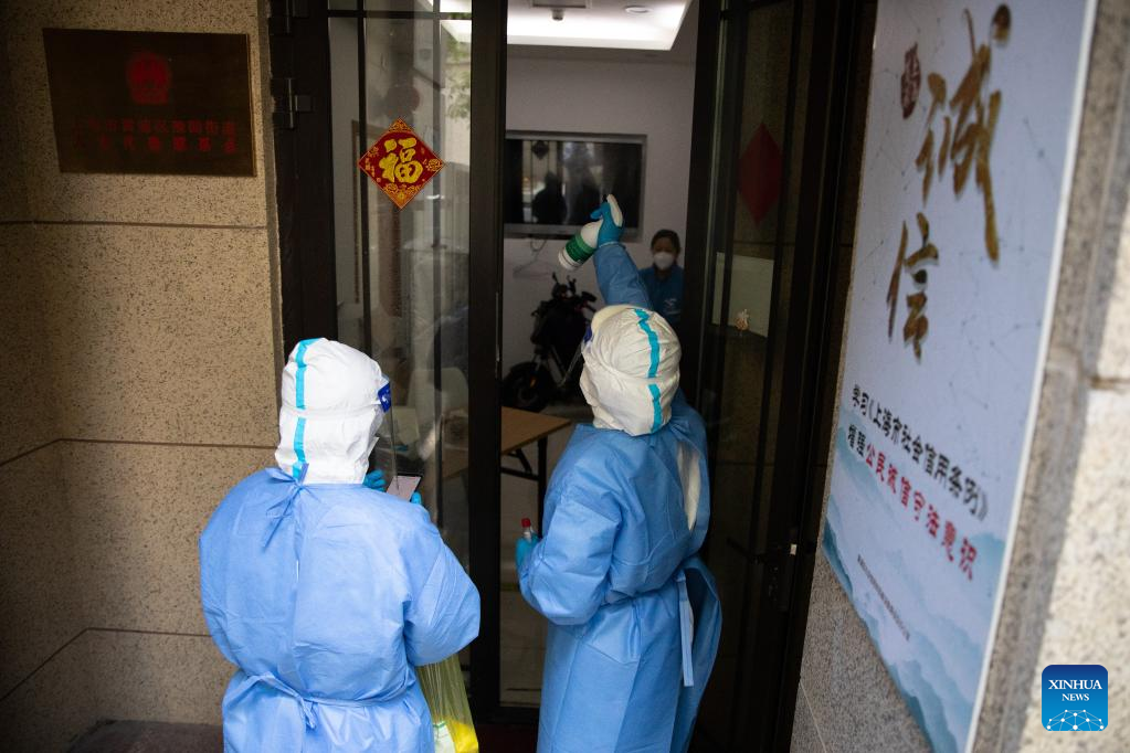 Medical workers disinfect the building where they took swab samples from residents for nucleic acid testing at the Guangfu residential area in Yuyuan sub-district in Shanghai, east China, April 16, 2022.(Xinhua/Jin Liwang)