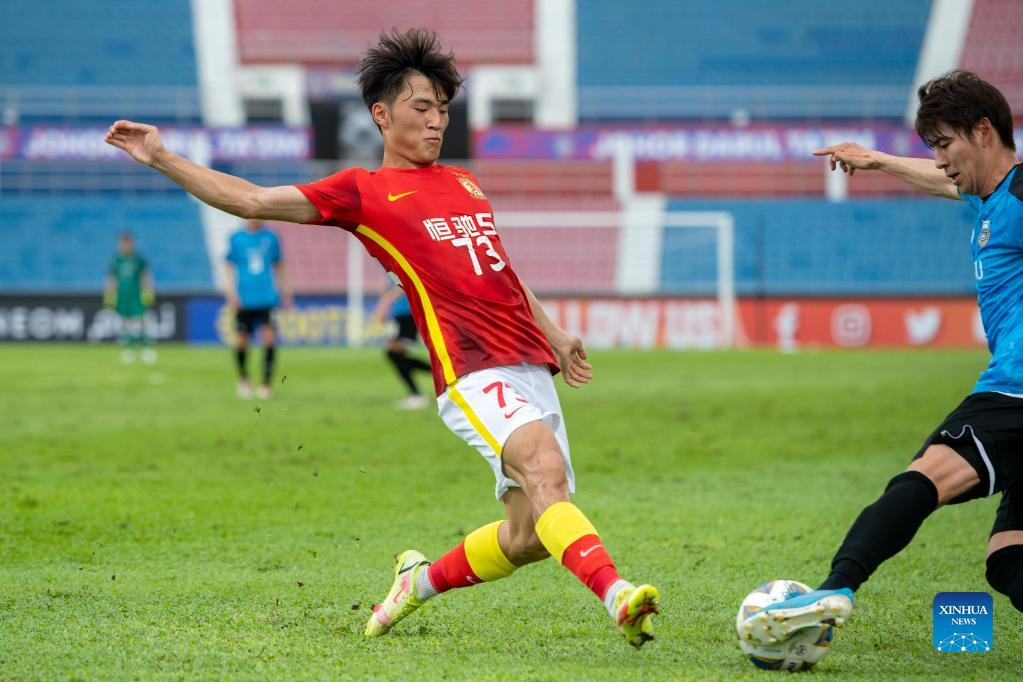 Fan Ruiwei (L) of Guangzhou FC competes during the AFC Champions League 2022 Group I match between Guangzhou FC of China and Kawasaki Frontale of Japan in Johor Bahru, Malaysia, April 18, 2022. (Photo by Chong Voon Chung/Xinhua)
