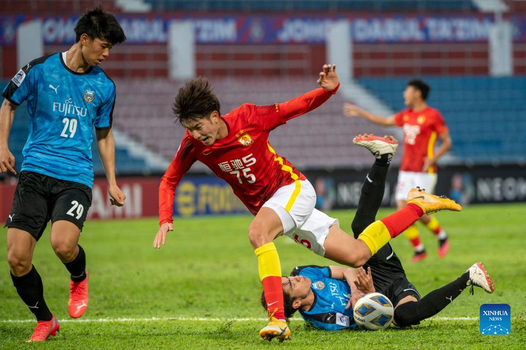 Guo Shuai (C) of Guangzhou FC competes during the AFC Champions League 2022 Group I match between Guangzhou FC of China and Kawasaki Frontale of Japan in Johor Bahru, Malaysia, April 18, 2022. (Photo by Chong Voon Chung/Xinhua)