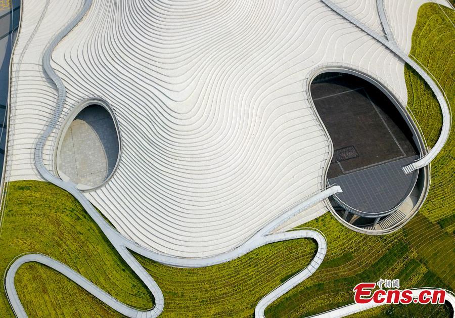 Aerial view of 'silver terrace'-shaped art museum in Wuhan