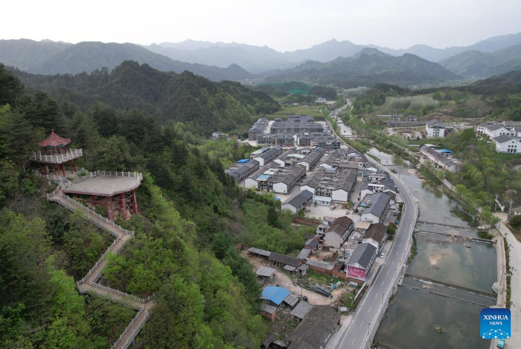 Aerial photo taken on April 18, 2022 shows Huayang township in Yangxian County of Hanzhong, northwest China's Shaanxi Province. Yangxian County, dubbed the "hometown of the crested ibis", has boosted its green economy to create a good habitat for crested ibis while developing the economy. (Xinhua/Shao Rui)