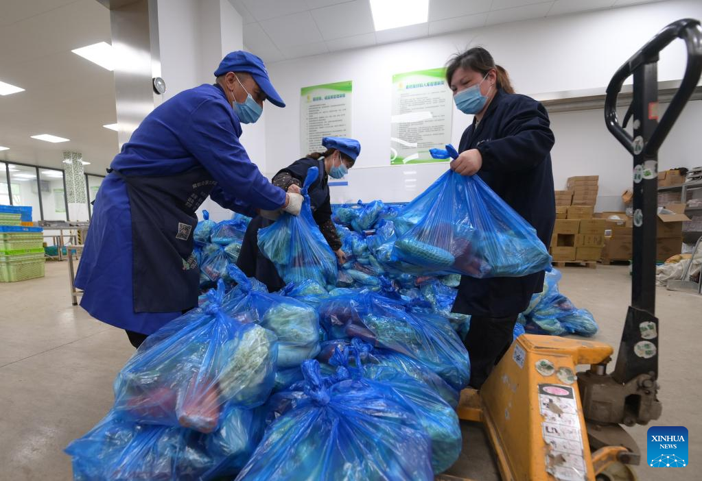Employees pack vegetables to be sent to the urban areas at a planting base in Chongming District, east China's Shanghai, April 19, 2022. Vegetable production and processing enterprises in Chongming District have been making efforts to assure the vegetable supply to the urban areas amid the recent COVID-19 outbreak in the metropolis. (Xinhua/Li He)