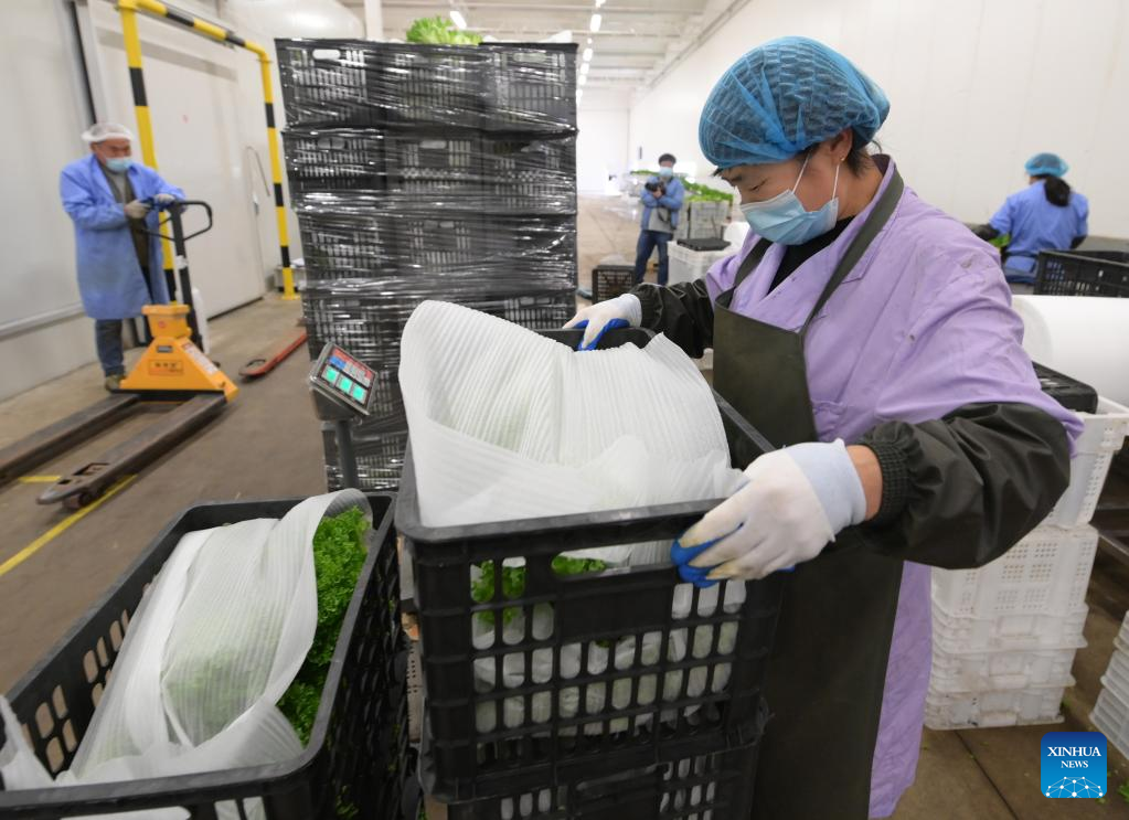 Photo taken on April 19, 2022 shows vegetables in a greenhouse at a planting base in Chongming District, east China's Shanghai. Vegetable production and processing enterprises in Chongming District have been making efforts to assure the vegetable supply to the urban areas amid the recent COVID-19 outbreak in the metropolis. (Xinhua/Li He)