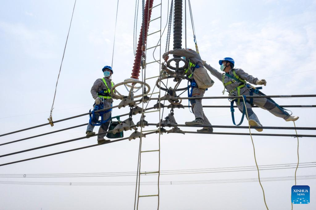 In pics: maintenance work of power transmission project in Lujiang, east China (5)
