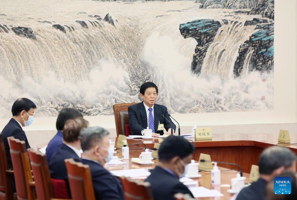 Li Zhanshu, chairman of the National People's Congress (NPC) Standing Committee, presides over the 115th meeting of the Council of Chairpersons of the 13th NPC Standing Committee at the Great Hall of the People in Beijing, capital of China, April 19, 2022. (Xinhua/Yao Dawei)