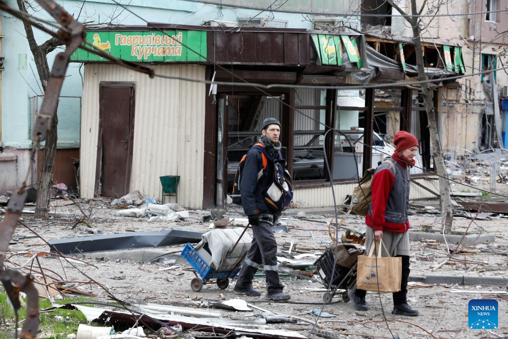 Residents walk near damaged buildings in Mariupol on April 18, 2022. (Photo by Victor/Xinhua)