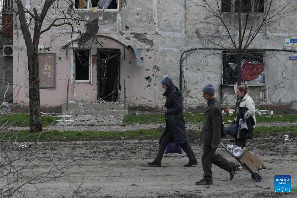 Residents walk past a damaged building in Mariupol on April 18, 2022. (Photo by Victor/Xinhua)