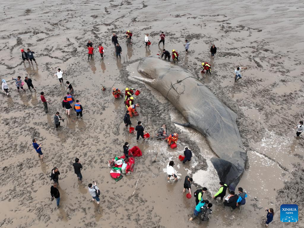 Rescuers on Wednesday morning helped a whale get back into the sea in Xiangshan County of Ningbo, east China's Zhejiang Province.