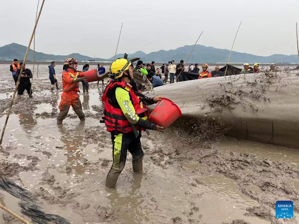 Rescuers help a stranded whale in Xiangshan County of Ningbo, east China's Zhejiang Province, April 19, 2022.