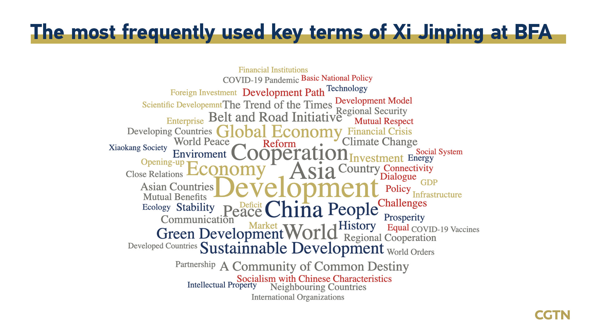 The global economy and the Belt and Road Initiative (BRI) are also frequently mentioned in Xi's BFA speeches.