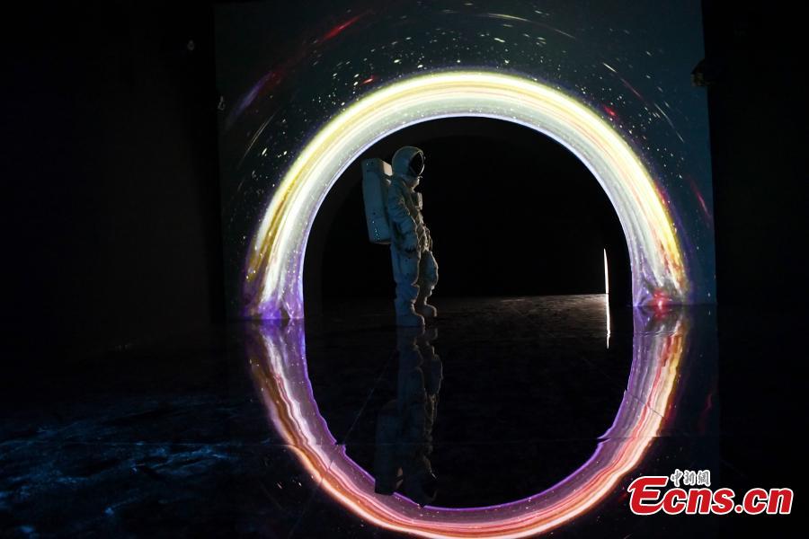 A man travels through black hole in space suit at "Bondless: Creative Art Exhibition on Chinese Aerospace" in Chengdu, southwest China's Sichuan Province, April 19, 2022. (Photo: China News Service/Zhang Lang)