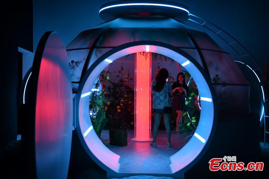 People visit the exhibition "Bondless: Creative Art Exhibition on Chinese Aerospace" in Chengdu, southwest China's Sichuan Province, April 19, 2022. (Photo: China News Service/Zhang Lang)