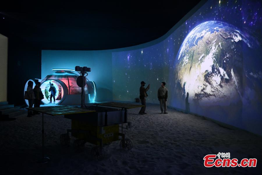 People visit the exhibition "Bondless: Creative Art Exhibition on Chinese Aerospace" in Chengdu, southwest China's Sichuan Province, April 19, 2022. (Photo: China News Service/Zhang Lang)