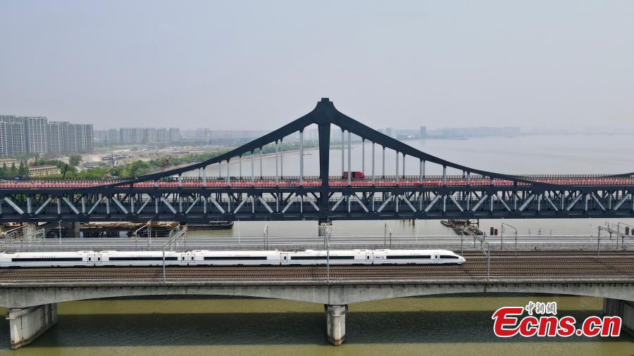 Drone photo taken on April 19,2022 shows a high-speed train running pass the renovated Pengbu Bridge, a reconstruction project along the Shanghai-Hangzhou-Ningbo Conventional Expressway, in Hangzhou, east China's Zhejiang Province. (Photo: China News Service/Dong Yixin)