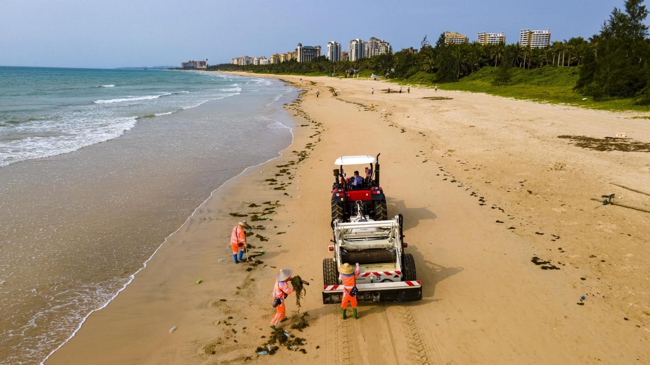 Sanitation workers clean a beach in Boao township, Qionghai, south China's Hainan province, April 13, 2022. (People's Daily Online/Meng Zhongde)
