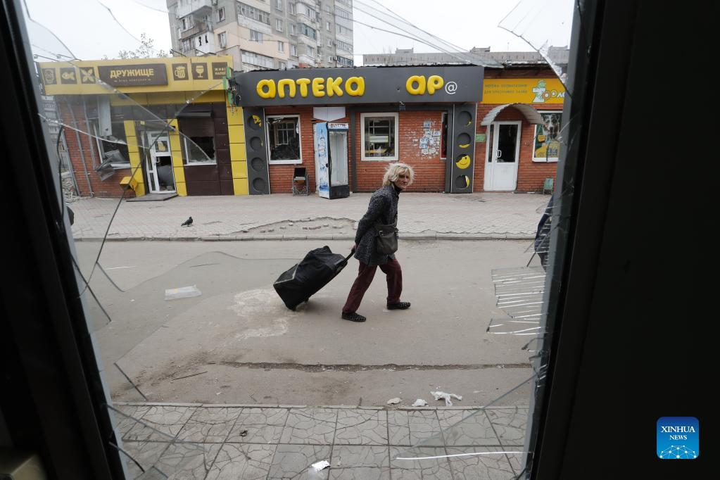 A resident walks past a damaged building in Mariupol on April 19, 2022. Ukraine and Russia have reached a preliminary agreement on establishing a humanitarian corridor to evacuate women, children and the elderly from the embattled city of Mariupol, Ukrainian Deputy Prime Minister Iryna Vereshchuk said on Wednesday. (Photo by Victor/Xinhua)