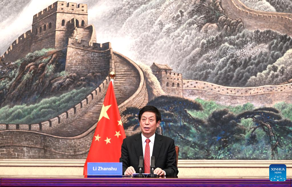 Li Zhanshu, chairman of the National People's Congress (NPC) Standing Committee, holds a video conversation with Malawi's parliament speaker Catherine Gotani Hara at the Great Hall of the People in Beijing, capital of China, April 20, 2022. (Xinhua/Rao Aimin)