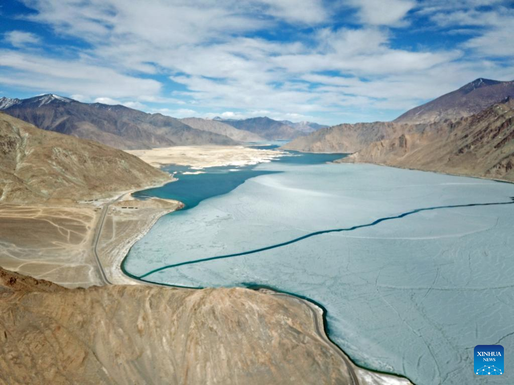 Photo taken with a mobile phone shows the Banggong Lake in Ngari, southwest China's Tibet Autonomous Region, April 8, 2022.