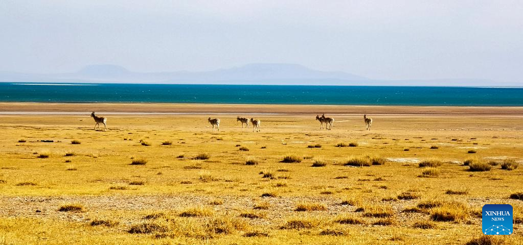 Photo taken with a mobile phone shows a herd of Tibetan gazelles near Serling Tso Lake in Nagqu, southwest China's Tibet Autonomous Region, April 13, 2022.