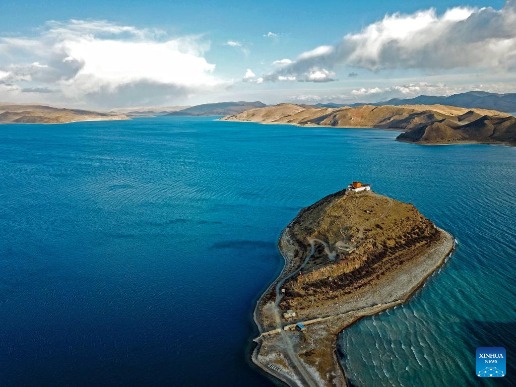 Aerial photo taken on April 16, 2022 shows the scenery of the Yamzbog Yumco Lake in Shannan, southwest China's Tibet Autonomous Region.