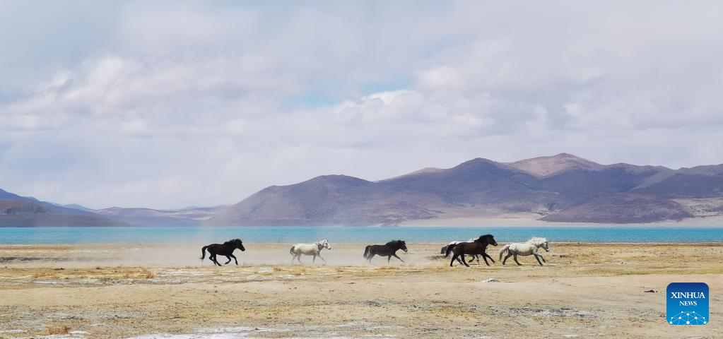 Photo taken with a mobile phone shows a herd of horses running near Baiku Lake in Nyalam County of Xigaze, southwest China's Tibet Autonomous Region, May 14, 2021.