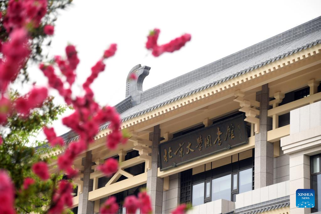 Photo taken on April 21, 2022 shows the exterior view of Peking University Library in Beijing, capital of China.