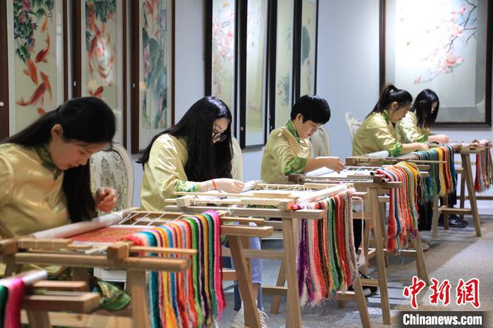 A student of Zhang Liufeng works on a Bian embroidery product. (Photo/Deng Xiaoqiang)