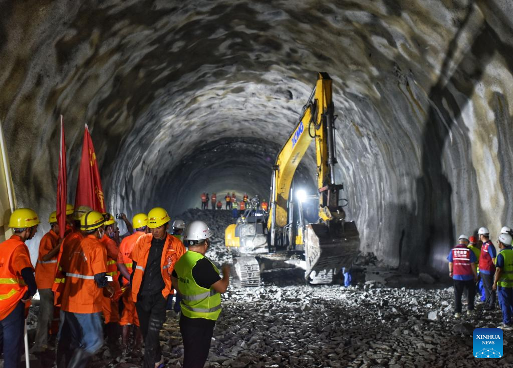 Workers are seen at the construction site of Futoushi Tunnel of Guangzhou-Shanwei Railway in Huidong County of Huizhou, south China's Guangdong Province, April 22, 2022. The Futoushi tunnel of Guangzhou-Shanwei Railway was drilled through on Friday. The 206.2km-long Guangzhou-Shanwei Railway with a maximum speed of 350 km per hour is expected to be put into operation in 2023. (Xinhua/Liu Dawei)