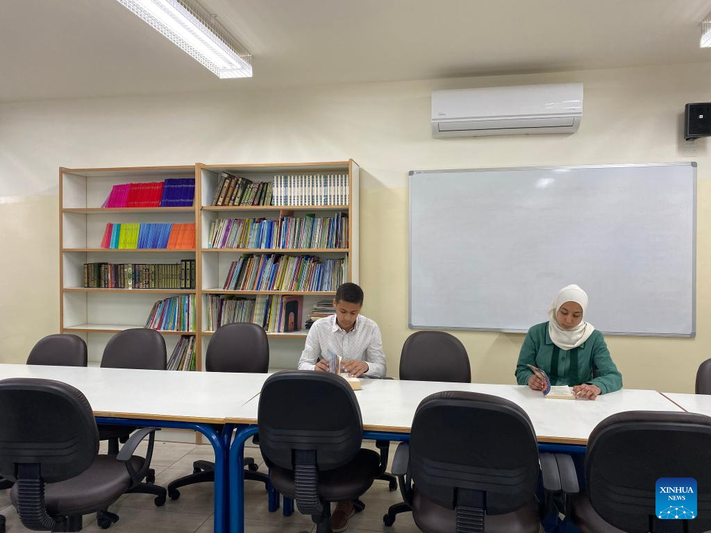 Abdelrahman Fawzi (L), a 16-year-old refugee student from the Gaza Strip, reads a book at a school's library of the United Nations Relief and Works Agency for Palestine Refugees in the Near East (UNRWA) in Amman, Jordan, on April 21, 2022. (Xinhua/Ji Ze)