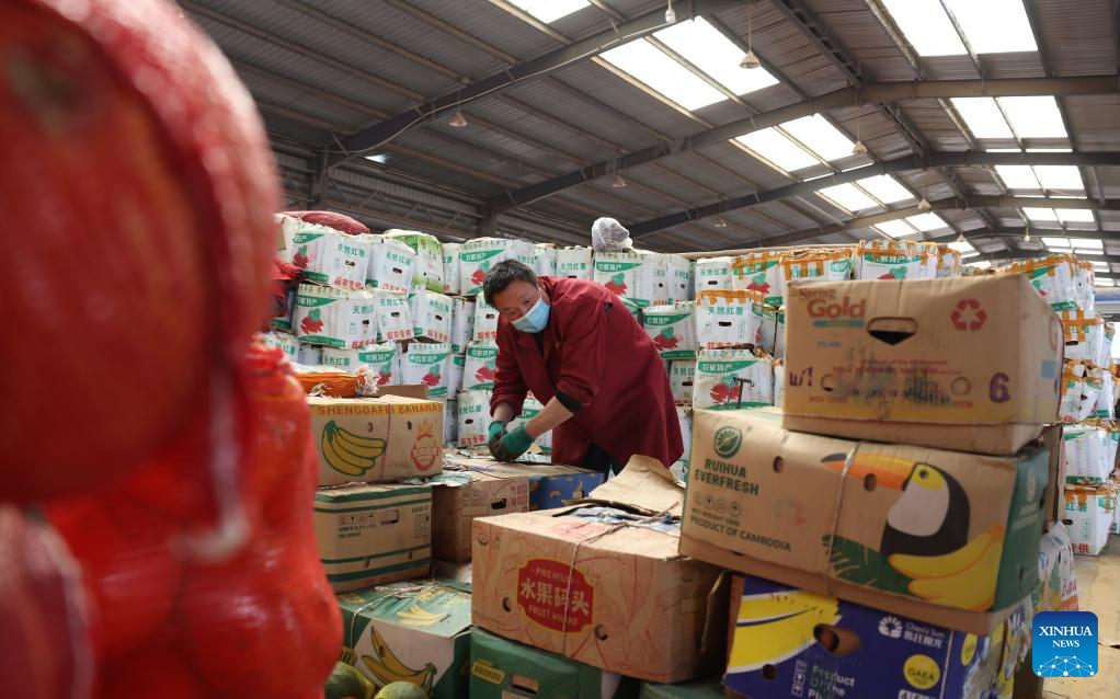 A vendor arranges vegetables to be sold at an agricultural products distribution center in Xining, northwest China's Qinghai Province, April 23, 2022.