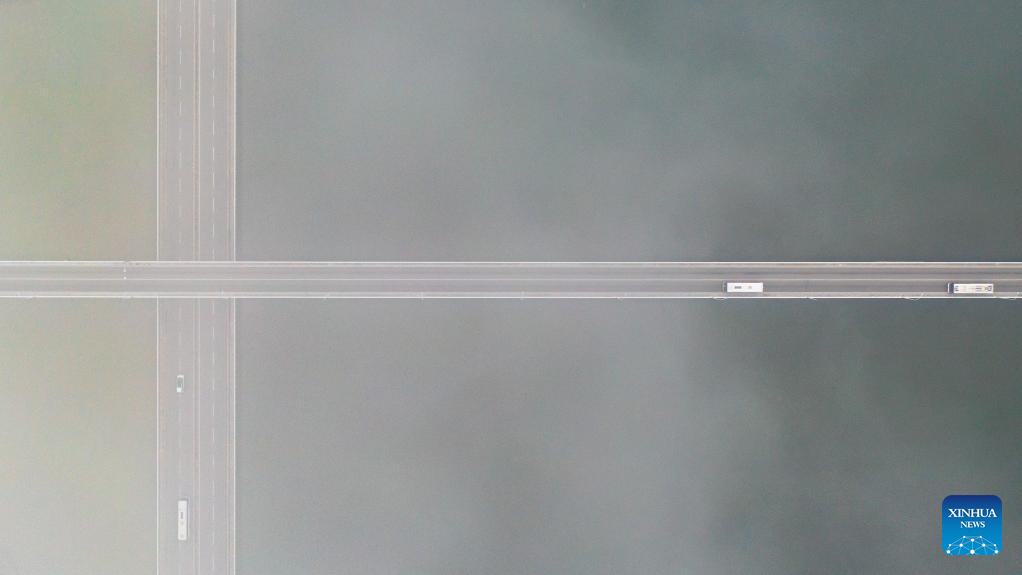 Aerial photo taken on April 23, 2022 shows the Governador Nobre de Carvalho Bridge in mist in Macao, south China. (Xinhua/Cheong Kam Ka)