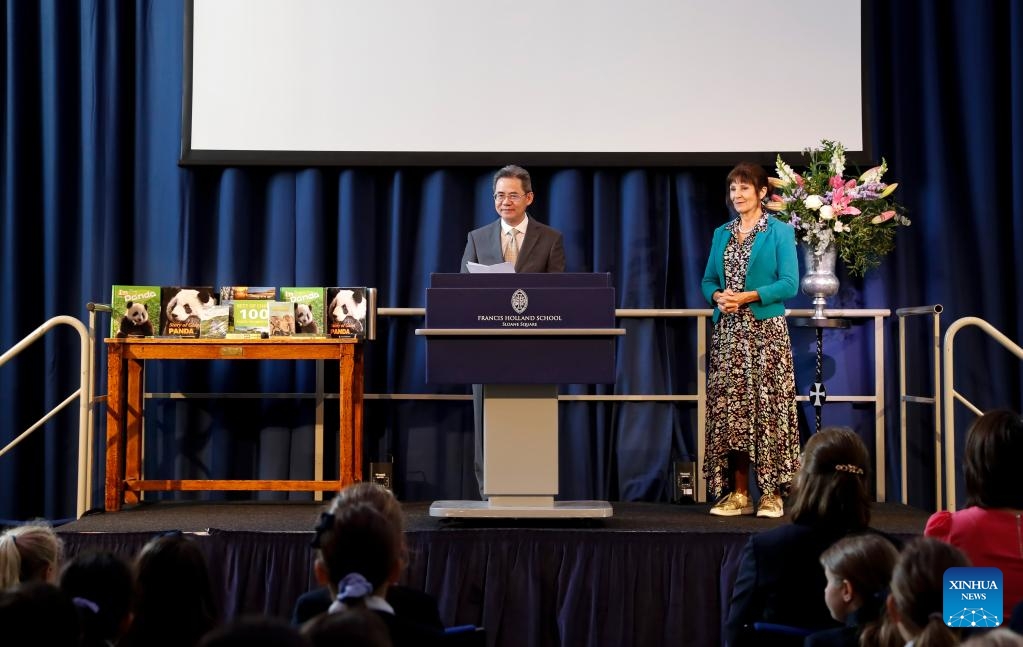 Chinese Ambassador to Britain Zheng Zeguang (L) reads a reply letter from Chinese President Xi Jinping at Francis Holland School in London, Britain, April 21, 2022. Chinese President Xi Jinping has recently replied to a letter from primary school students at Britain's Francis Holland School on the issue of climate change. (Xinhua/Han Yan)