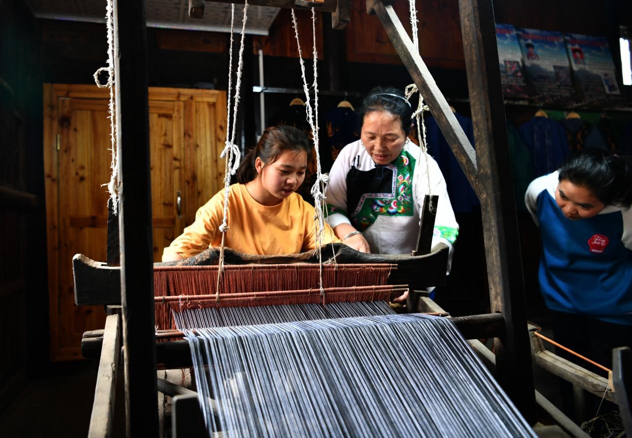 Long Laoxiang (middle), a master of Miao embroidery, teaches a college graduate apprentice to weave cloth with a handloom in Zila village, Shilan township, Huayuan county, Xiangxi Tujia and Miao autonomous prefecture, central China’s Hunan province, April 29, 2020. (People’s Daily Online/Long Enze)