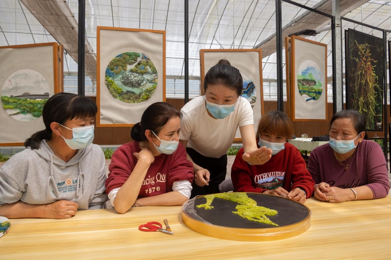 Villagers learn how to make moss paintings in Maoyang township, Jingning She autonomous county, Lishui city, east China’s Zhejiang province, April 13, 2022. (People’s Daily Online/Li Suren)