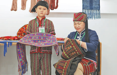 Master craftswoman Liu Xianglan and her grandson attend a show to present Li brocade weaving techniques. (Photo courtesy of the convergence media center of Wuzhishan city)