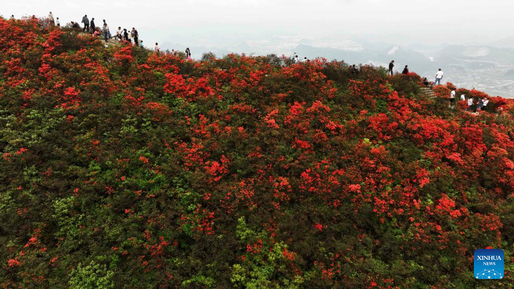 Aerial photo taken on April 23, 2022 shows tourists viewing blooming azalea flowers at Longquan Mountain in Danzhai County, southwest China's Guizhou Province. The sight of azalea flowers stretched across the mountain offers a spectacular view and is a gratifying reward for tourists who come here to enjoy the flowers while hiking. (Xinhua/Yang Ying)
