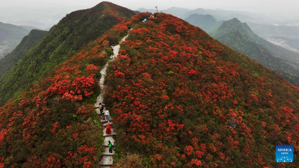 Aerial photo taken on April 23, 2022 shows tourists viewing blooming azalea flowers at Longquan Mountain in Danzhai County, southwest China's Guizhou Province. The sight of azalea flowers stretched across the mountain offers a spectacular view and is a gratifying reward for tourists who come here to enjoy the flowers while hiking. (Xinhua/Yang Ying)
