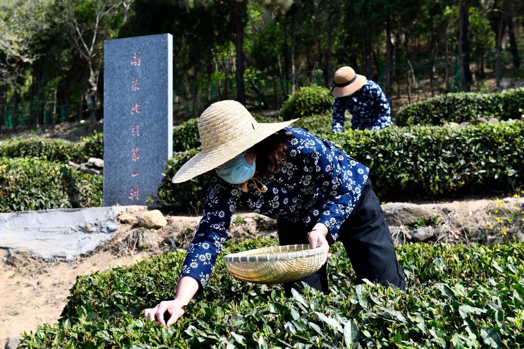 Photo taken on April 22, 2022 shows tea farmers picking spring tea at a tea plantation in Lanshan District of Rizhao City, east China's Shandong Province. The harvest season of spring tea has started in Rizhao. The tea industry helps increase local villagers' income and promote rural revitalization. (Xinhua/Guo Xulei)