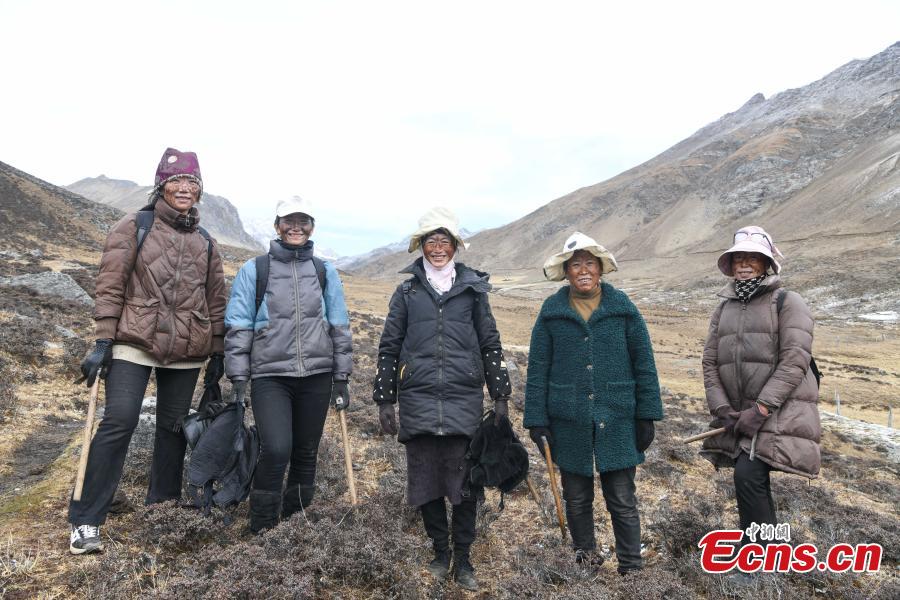 Villagers pose for group photos before collecting caterpillar fungus in Gyaca County, southwest China's Tibet Autonomous Region, April 22, 2022. Caterpillar fungus has entered the annual harvest season in Tibet. (Photo/China News Service)
